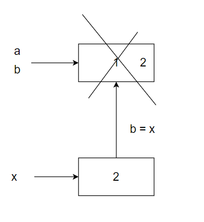 b = x, 是将x指向的值赋值给b指向的值, 而不是引用b更改引用的对象