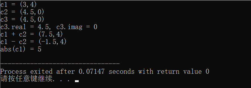 1 #include<iostream> 2 #include<complex> 3 4 void test_std_complex() 5 { 6 using namespace std; 7 complex<double> c1{3,4},c2{4.5}; 8 const complex<double> c3{c2}; 9 10 cout << "c1 = " << c1 << endl; 11 cout << "c2 = " << c2 << endl; 12 cout << "c3 = " << c3 << endl; 13 cout << "c3.real = " << c3.real() << ", " << "c3.imag = " << c3.imag() 14 << endl; 15 16 cout << "c1 + c2 = " << c1 + c2 << endl; 17 cout << "c1 - c2 = " << c1 - c2 << endl; 18 cout << "abs(c1) = " << abs(c1) << endl; 19 20 } 21 22 int main() 23 { 24 test_std_complex(); 25 }