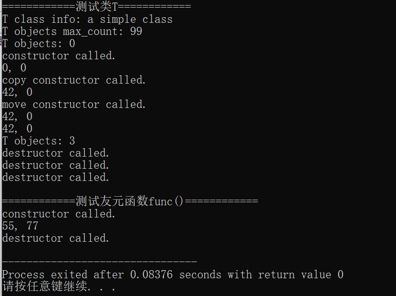 1 #include <iostream> 2 #include <string> 3 using namespace std; 4 5 class T 6 { 7 public: 8 T(int x=0,int y=0); 9 T(const T &t); 10 T(T &&t); 11 ~T(); 12 13 void set_m1(int x); 14 int get_m1() const; 15 int get_m2() const; 16 void display() const; 17 friend void func(); 18 19 private: 20 int m1,m2; 21 22 public: 23 static void display_count(); 24 25 public: 26 static const string doc; 27 static const int max_count; 28 29 private: 30 static int count; 31 }; 32 33 const string T::doc{"a simple class"}; 34 const int T::max_count = 99; 35 int T::count = 0; 36 37 T::T(int x,int y):m1{x},m2{y} 38 { 39 ++count; 40 cout << "constructor called.\n"; 41 } 42 43 T::T(const T &t):m1{t.m1},m2{t.m2} 44 { 45 ++count; 46 cout << "copy constructor called.\n"; 47 } 48 49 T::T(T &&t):m1{t.m1},m2{t.m2} 50 { 51 ++count; 52 cout << "move constructor called.\n"; 53 } 54 55 T::~T() { 56 --count; 57 cout << "destructor called.\n"; 58 } 59 60 void T::set_m1(int x) 61 { 62 m1=x; 63 } 64 int T::get_m1() const { 65 return m1; 66 } 67 int T::get_m2() const { 68 return m2; 69 } 70 void T::display() const { 71 cout << m1 << ", " << m2 << endl; 72 } 73 void T::display_count() { 74 cout << "T objects: " << count << endl; 75 } 76 77 78 void func() 79 { 80 T t1; 81 t1.set_m1(55); 82 t1.m2=77; 83 t1.display(); 84 } 85 86 87 void test() { 88 cout << "T class info: " << T::doc << endl; 89 cout << "T objects max_count: " << T::max_count << endl; 90 T::display_count(); 91 T t1; 92 t1.display(); 93 t1.set_m1(42); 94 T t2{t1}; 95 t2.display(); 96 T t3{std::move(t1)}; 97 t3.display(); 98 t1.display(); 99 T::display_count(); 100 } 101 102 int main() { 103 cout << "============测试类T============" << endl; 104 test(); 105 cout << endl; 106 cout << "============测试友元函数func()============" << endl; 107 func(); 108 }