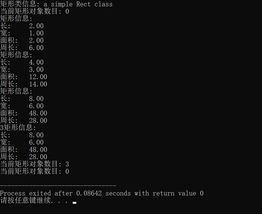 1 #include <iostream> 2 #include <string> 3 #include <iomanip> 4 using namespace std; 5 // 矩形类Rect的定义 6 // 待补足 7 // ××× 8 // 普通函数:输出矩形信息 9 class Rect { 10 public: 11 Rect(double length = 2.0, double width = 1.0); 12 Rect(const Rect &r); 13 ~Rect(); 14 double len() const; 15 double wide() const; 16 double circumference() const; 17 double area() const; 18 void resize(double times); 19 void resize(double length_times, double width_times); 20 public: 21 static const string doc; 22 void display() const; 23 static int size_info(); 24 private: 25 double length, width; 26 static int size; 27 }; 28 const string Rect::doc{"a simple Rect class"}; 29 int Rect::size = 0; 30 Rect::Rect(double length, double width): length{length}, width(width) { 31 ++size; 32 } 33 Rect::Rect(const Rect &r): length{r.length}, width{r.width} { 34 ++size; 35 } 36 Rect::~Rect() { 37 --size; 38 } 39 double Rect::len() const{ 40 return length; 41 } 42 double Rect::wide() const { 43 return width; 44 } 45 double Rect::circumference() const { 46 return 2 * length + 2 * width; 47 } 48 double Rect::area() const { 49 return length * width; 50 } 51 void Rect::resize(double times) { 52 length *= times; 53 width *= times; 54 } 55 void Rect::resize(double length_times, double width_times) { 56 cout << size; 57 } 58 int Rect::size_info() { 59 return size; 60 } 61 void output(const Rect &r) { 62 cout << "矩形信息: " << endl; 63 cout << fixed << setprecision(2); // 控制输出格式:以浮点数形式输出,小数部分保留两位 64 cout << "长: " << r.len() << endl; 65 cout << "宽: " << r.wide() << endl; 66 cout << "面积: " << r.area() << endl; 67 cout << "周长: " << r.circumference() << endl; 68 // 补足代码:分行输出矩形长、宽、面积、周长 69 // ××× 70 } 71 // 测试代码 72 void test() { 73 cout << "矩形类信息: " << Rect::doc << endl; 74 cout << "当前矩形对象数目: " << Rect::size_info() << endl; 75 Rect r1; 76 output(r1); 77 Rect r2(4, 3); 78 output(r2); 79 Rect r3(r2); 80 r3.resize(2); 81 output(r3); 82 r3.resize(5, 2); 83 output(r3); 84 cout << "当前矩形对象数目: " << Rect::size_info() << endl; 85 } 86 // 主函数 87 int main() { 88 test(); 89 cout << "当前矩形对象数目: " << Rect::size_info() << endl; 90 }
