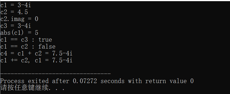 1 #include <iostream> 2 #include <cmath> 3 class Complex { 4 public: 5 Complex(double r = 0, double i = 0) { 6 real = r; 7 imag = i; 8 } 9 Complex(const Complex& x) { 10 real = x.real; 11 imag = x.imag; 12 } 13 double get_real() const 14 { return real; } 15 double get_imag() const 16 { return imag; } 17 void add(const Complex& x) { 18 real += x.real; 19 imag += x.imag; 20 } 21 void show(){ 22 std::cout << real; 23 if (imag>0) std::cout << "+" << abs(imag) << "i"; 24 if (imag<0) std::cout << "-" << abs(imag) << "i"; 25 } 26 void show() const{ 27 std::cout << real; 28 if (imag>0) std::cout << "+" << abs(imag) << "i"; 29 if (imag<0) std::cout << "-" << abs(imag) << "i"; 30 } 31 friend Complex add(const Complex& c1, const Complex& c2); 32 friend bool is_equal(const Complex& c1, const Complex& c2); 33 friend double abs(const Complex& c1); 34 private: 35 double real; 36 double imag; 37 }; 38 Complex add(const Complex& c1, const Complex& c2) { 39 double real = c1.real + c2.real; 40 double imag = c1.imag + c2.imag; 41 return Complex(real, imag); 42 } 43 bool is_equal(const Complex& c1, const Complex& c2) { 44 if (c1.real == c2.real && c1.imag == c2.imag) 45 return true; 46 else 47 return false; 48 } 49 double abs(const Complex& c1) { 50 return sqrt(c1.real * c1.real + c1.imag * c1.imag); 51 } 52 void test() { 53 using namespace std; 54 Complex c1(3, -4); 55 const Complex c2(4.5); 56 Complex c3(c1); 57 cout << "c1 = "; 58 c1.show(); 59 cout << endl; 60 cout << "c2 = "; 61 c2.show(); 62 cout << endl; 63 cout << "c2.imag = " << c2.get_imag() << endl; 64 cout << "c3 = "; 65 c3.show(); 66 cout << endl; 67 cout << "abs(c1) = "; 68 cout << abs(c1) << endl; 69 cout << boolalpha; 70 cout << "c1 == c3 : " << is_equal(c1, c3) << endl; 71 cout << "c1 == c2 : " << is_equal(c1, c2) << endl; 72 Complex c4; 73 c4 = add(c1, c2); 74 cout << "c4 = c1 + c2 = "; 75 c4.show(); 76 cout << endl; 77 c1.add(c2); 78 cout << "c1 += c2, " << "c1 = "; 79 c1.show(); 80 cout << endl; 81 } 82 int main() { 83 test(); 84 }
