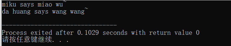 #pragma once #include<iostream> #include<string> using std::cout; using std::cin; using std::endl; using std::string; class MachinePets{ public: MachinePets(const string s):nickname(s){} const string get_nickname(){ return nickname; } virtual string talk()=0; private: string nickname; }; class PetCats:public MachinePets{ private: const string m="miao wu~" ; public: PetCats(const string &a):MachinePets{a}{} string talk(){ return m; } }; class PetDogs:public MachinePets{ private: const string d="wang wang~" ; public: PetDogs(const string &a):MachinePets{a}{} string talk(){ return d; } };