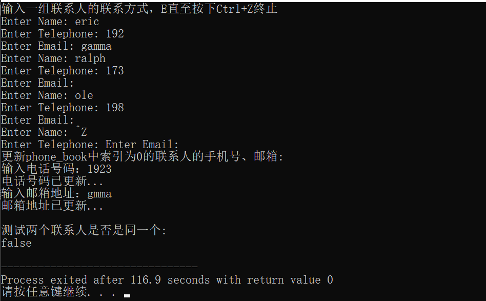 #include <iostream> #include <vector> #include "Person.hpp" void test() { using namespace std; vector<Person> phone_book; Person p; cout << "输入一组联系人的联系方式,E直至按下Ctrl+Z终止\n"; while(cin >> p) phone_book.push_back(p); cout << "\n更新phone_book中索引为0的联系人的手机号、邮箱:\n"; phone_book.at(0).update_telephone(); phone_book.at(0).update_email(); cout << "\n测试两个联系人是否是同一个:\n"; cout << boolalpha << (phone_book.at(0) == phone_book.at(1)) << endl; } int main() { test(); }