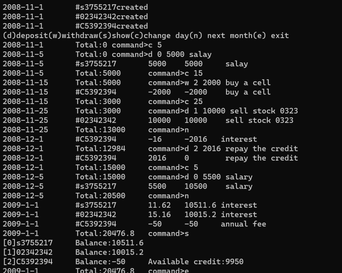 #include"account.h" #include<iostream> using namespace std; int main() { Date date(2008, 11, 1); SavingsAccount sa1(date, "s3755217", 0.015); SavingsAccount sa2(date, "02342342", 0.015); CreditAccount ca(date, "C5392394", 10000, 0.0005, 50); Account* accounts[] = { &sa1,&sa2,&ca }; const int n = sizeof(accounts) / sizeof(Account*); cout << "(d)deposit(w)withdraw(s)show(c)change day(n) next month(e) exit" << endl; char cmd; do { date.show(); cout << "\tTotal:" << Account::getToal() << "\tcommand"; int index, day; double amount; string desc; cin >> cmd; switch (cmd) { case'd': cin >> index >> amount; getline(cin, desc); accounts[index]->deposit(date, amount, desc); break; case'w': cin >> index >> amount; getline(cin, desc); accounts[index]->withdraw(date, amount, desc); break; case's': for (int i = 0; i < n; i++) { cout << "[" << i << "]"; accounts[i]->show(); cout << endl; } break; case'c': cin >> day; if (day << date.getDay()) cout << "You cannot specify a previous day"; else if (day > date.getMaxDay()) cout << "Invalid day"; else date = Date(date.getYear(), date.getMonth(), day); break; case'n': if (date.getMonth() == 12) date = Date(date.getYear() + 1, 1, 1); else date = Date(date.getYear(), date.getMonth() + 1, 1); for (int i = 0; i < n; i++) accounts[i]->settle(date); break; } } while (cmd != 'e'); return 0; }