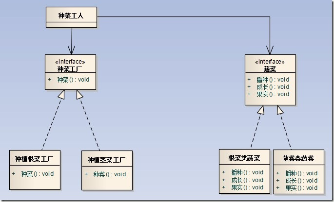 而在没一个层次,种菜工人所关心的对象也不一样,在简单工厂模式下,工人要想到种植萝卜还是白菜,在工厂模式下,工人想到是种植根菜还是茎菜,而在抽象工厂模式下,则关心种植基因菜还是非基因菜。