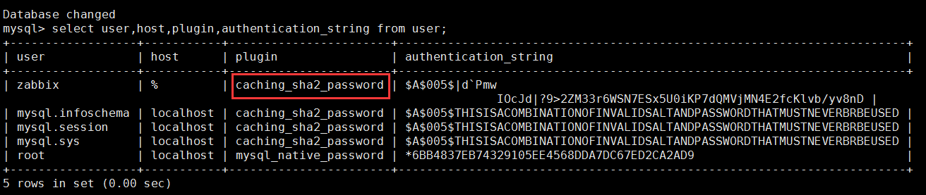 mysql> select user,host,plugin,authentication_string from user; # 查看身份验证插件是否为mysql_native_password