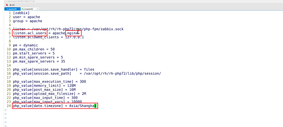 vim /etc/opt/rh/rh-php72/php-fpm.d/zabbix.conf