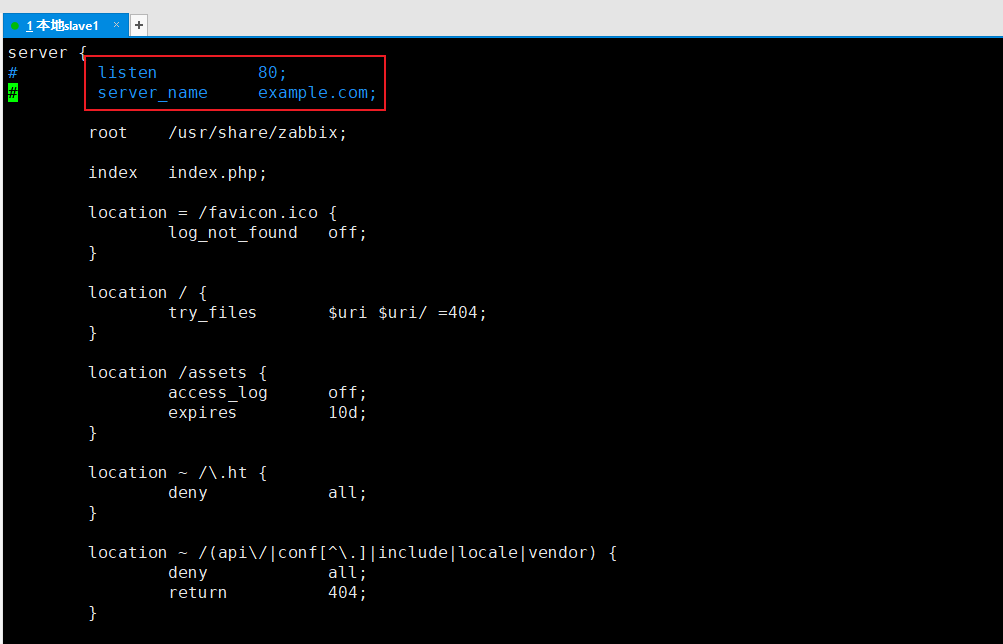 去掉listen的注释,将server_name example.com域名改为该机器的域名,如果没有域名则改为localhost