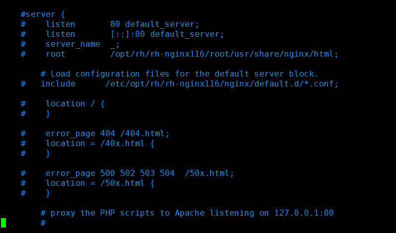 注释掉/etc/opt/rh/rh-nginx116/nginx/nginx.conf server为80的配置(因为/etc/opt/rh/rh-nginx116/nginx/conf.d/zabbix.conf也有server为80的配置不注释会冲突报错)