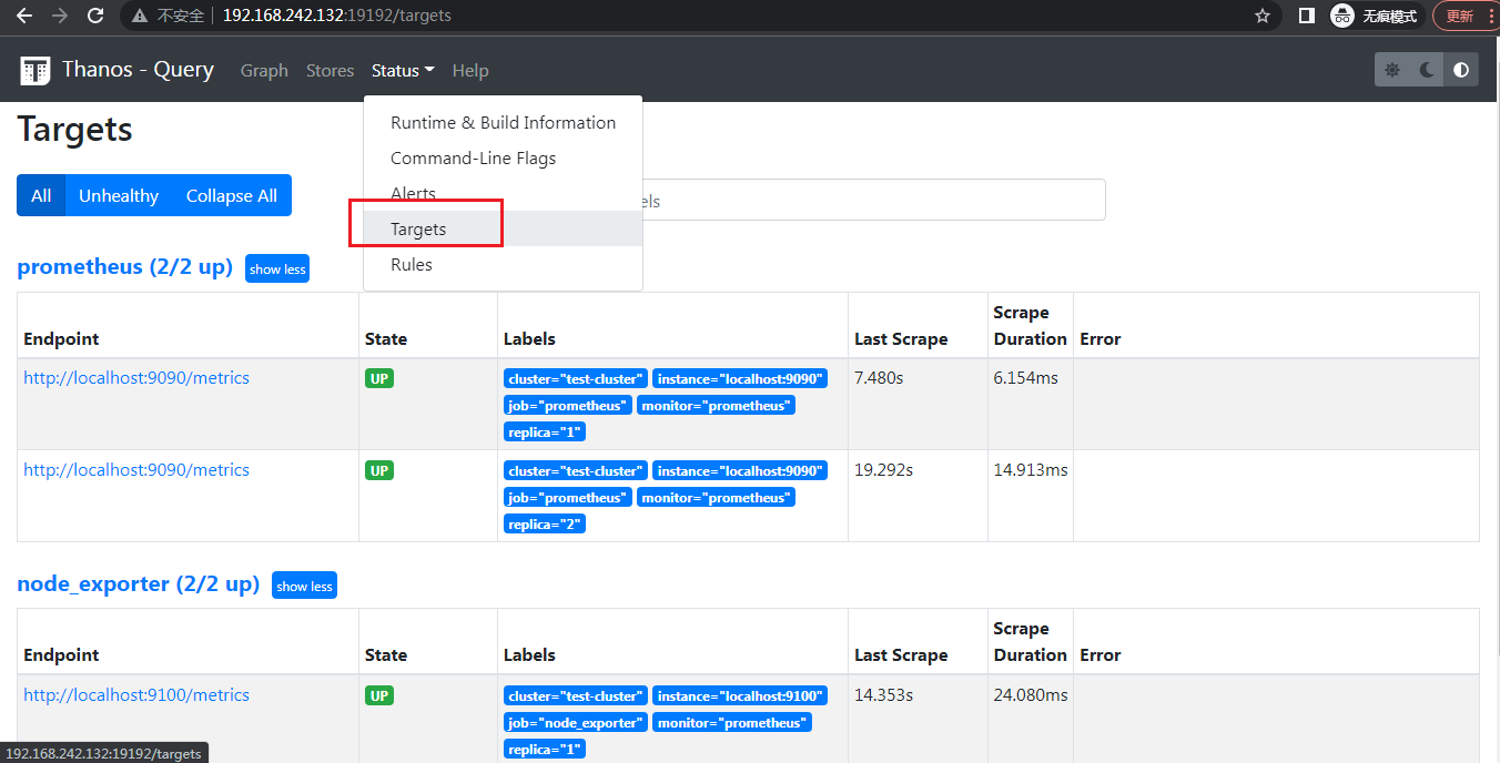 启动好后访问 thanos-query的控制台