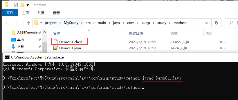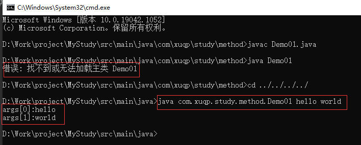 说明:找不到或无法加载主类Demo01的原因是该类位于package com.xuqp.study.method下,在该类所在包目录下是无法找到的,只能回到com包所在上级,然后用命令java com.xuqp.study.method.Demo01并加上需要传递的参数才能实现命令行传参。