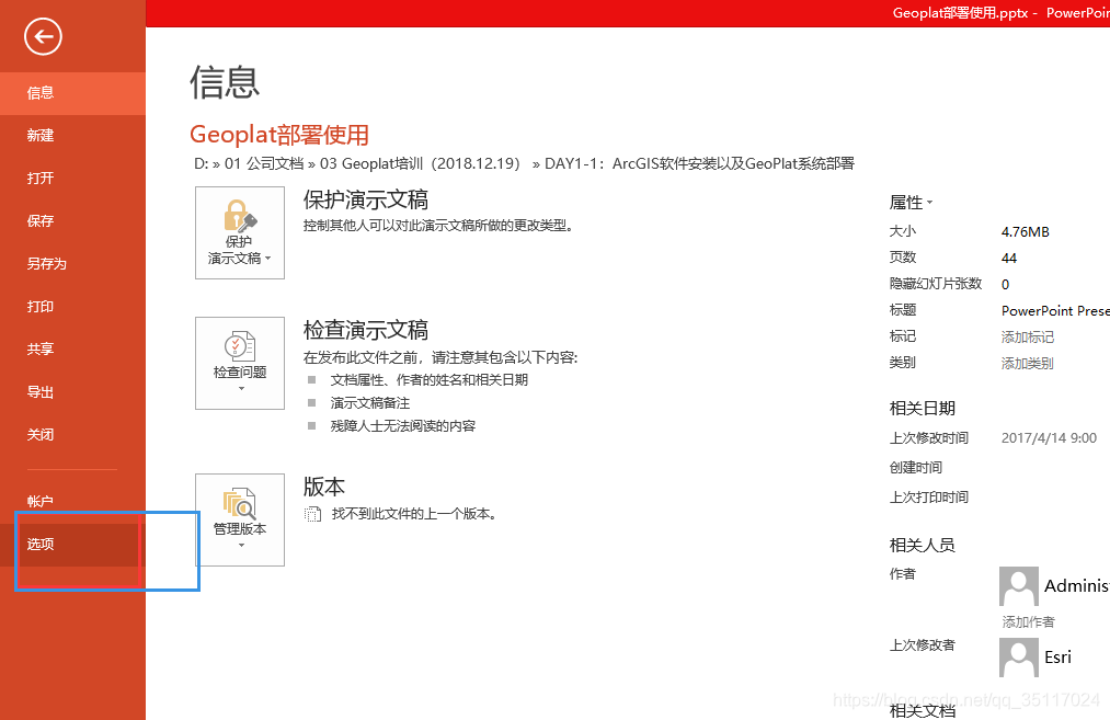1 在打开的PPT文件里选择左上角的“文件”菜单,然后点击“选项”,如图: