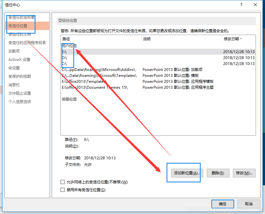 3 然后信任中心设置页面选择“受信任位置”,添加新位置,我们将所有的盘符根目录添加进去,如图: