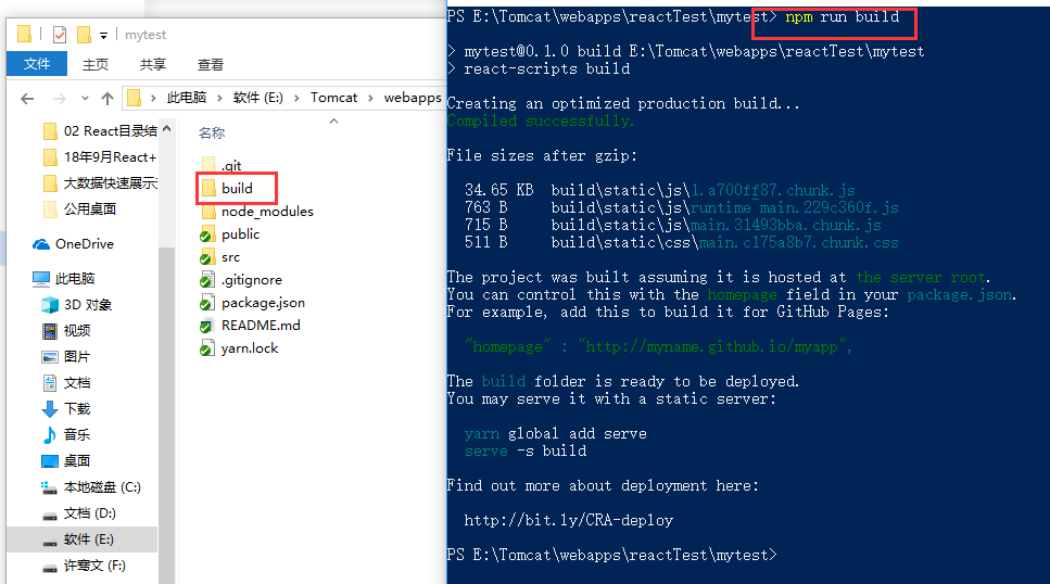 5 我们在本机的项目文件夹目录下启动命令行工具,输入“npm run build”来打包我们的项目文件,打包完成后在同目录下会生成一个build文件夹,如下图: