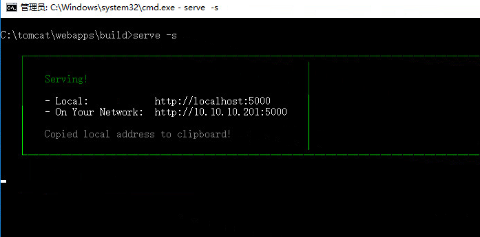 6 接下来我们将这个build文件夹拷贝到服务器的tomcat根目录下,然后进入build文件夹,启动命令行输入“serve -s”即可看到如下图(有时候项目目录下有dist文件夹,然后生成不了build文件夹,此文件夹等同于build,将此文件夹拷贝至想同目录下进行相同的后续步骤即可部署):