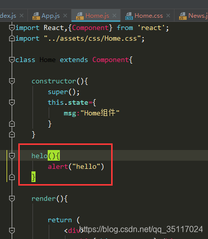 在react中定义方法的时候,可以在consructor()和render()平级定义方法,它们之间不能用逗号进行分割,如下所示: