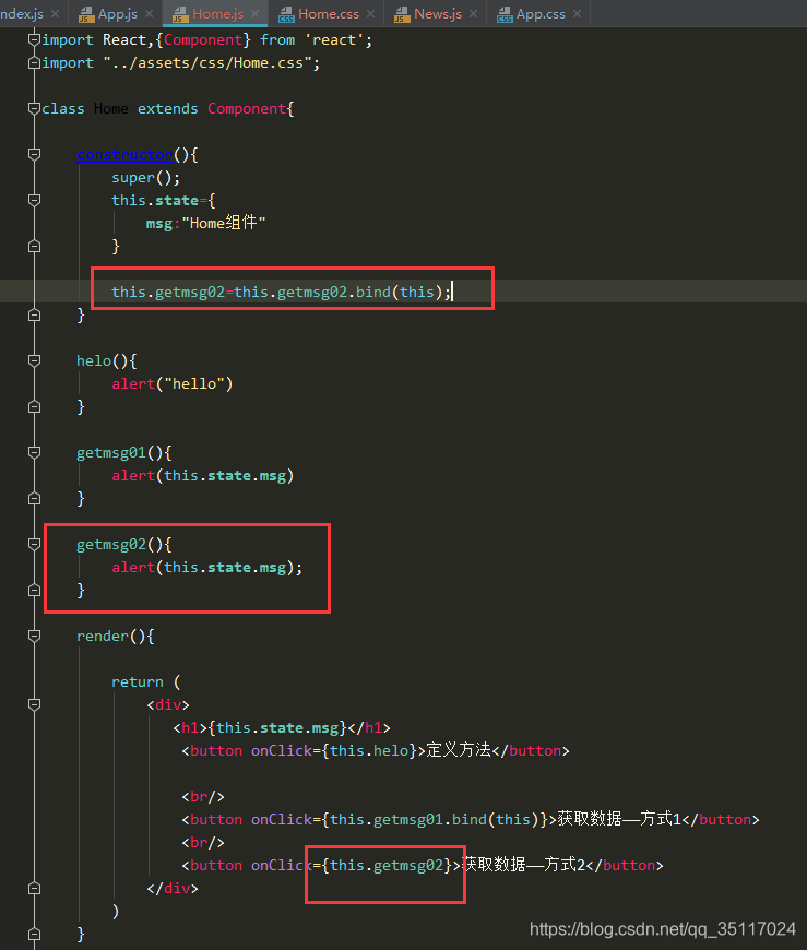 如果我们定义一个方法去获取this.state中的msg的值的时候,会牵扯到一个this指向的问题,所以会报类似于“无法获取到state属性”的错误。以下是三种处理方式,通过下面每一种处理方式我们都能顺利的获取到this.state的值,如下: