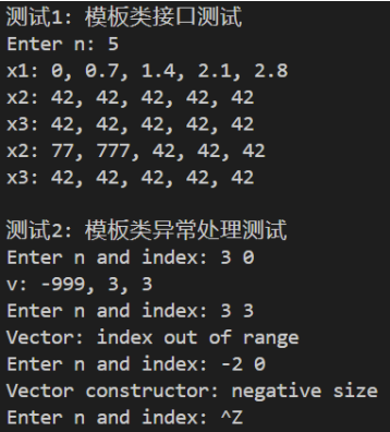 1 #include <iostream> 2 #include "Vector.hpp" 3 4 void test1() { 5 using namespace std; 6 7 int n; 8 cout << "Enter n: "; 9 cin >> n; 10 11 Vector<double> x1(n); 12 for(auto i = 0; i < n; ++i) 13 x1.at(i) = i * 0.7; 14 15 cout << "x1: "; output(x1); 16 17 Vector<int> x2(n, 42); 18 const Vector<int> x3(x2); 19 20 cout << "x2: "; output(x2); 21 cout << "x3: "; output(x3); 22 23 x2.at(0) = 77; 24 x2.at(1) = 777; 25 cout << "x2: "; output(x2); 26 cout << "x3: "; output(x3); 27 } 28 29 void test2() { 30 using namespace std; 31 32 int n, index; 33 while(cout << "Enter n and index: ", cin >> n >> index) { 34 try { 35 Vector<int> v(n, n); 36 v.at(index) = -999; 37 cout << "v: "; output(v); 38 } 39 catch (const exception &e) { 40 cout << e.what() << endl; 41 } 42 } 43 } 44 45 int main() { 46 cout << "测试1: 模板类接口测试\n"; 47 test1(); 48 49 cout << "\n测试2: 模板类异常处理测试\n"; 50 test2(); 51 }