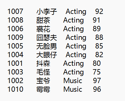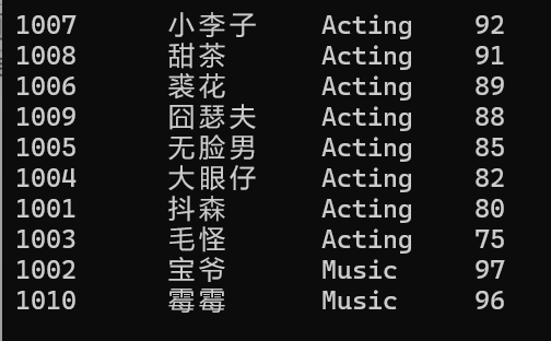 1 #include<iostream> 2 #include<fstream> 3 #include<string> 4 #include<vector> 5 #include<iomanip> 6 #include<algorithm> 7 8 using namespace std; 9 10 class student{ 11 public: 12 student() = default; 13 ~student() = default; 14 15 string get_major()const { 16 return major; 17 } 18 19 int get_score()const { 20 return score; 21 } 22 23 friend ostream& operator<<(ostream& out, const student& s) { 24 out << setiosflags(ios_base::left); 25 out << setw(10) << s.number 26 << setw(10) << s.name 27 << setw(10) << s.major 28 << setw(10) << s.score; 29 30 return out; 31 } 32 33 friend istream& operator>>(istream& in, student& s) { 34 in >>s.number >> s.name >> s.major >> s.score; 35 36 return in; 37 } 38 39 private: 40 string number; 41 string name; 42 string major; 43 int score; 44 45 }; 46 47 bool compare(const student& s1, const student& s2) { 48 if (s1.get_major() < s2.get_major()) 49 return true; 50 51 if (s1.get_major() == s2.get_major()) 52 return s1.get_score() > s2.get_score(); 53 54 return false; 55 } 56 57 void output(ostream& out, const vector<student>& v) { 58 for (auto& i : v) 59 out << i << endl; 60 } 61 62 void save(const string& filename, vector<student>& v) { 63 ofstream out(filename); 64 if (!out.is_open()) { 65 cout << "写入文件失败\n"; 66 return; 67 } 68 69 output(out, v); 70 out.close(); 71 } 72 73 void load(const string& filename, vector<student>& v) { 74 ifstream in(filename); 75 if (!in.is_open()) { 76 cout << "读取文件失败\n"; 77 return; 78 } 79 80 string title_line; 81 getline(in, title_line); 82 83 student t; 84 while (in >> t) 85 v.push_back(t); 86 87 in.close(); 88 } 89 90 int main() { 91 vector<student>v; 92 93 load("data5.txt", v); 94 sort(v.begin(), v.end(), compare); 95 output(cout, v); 96 save("ans5.txt", v); 97 }