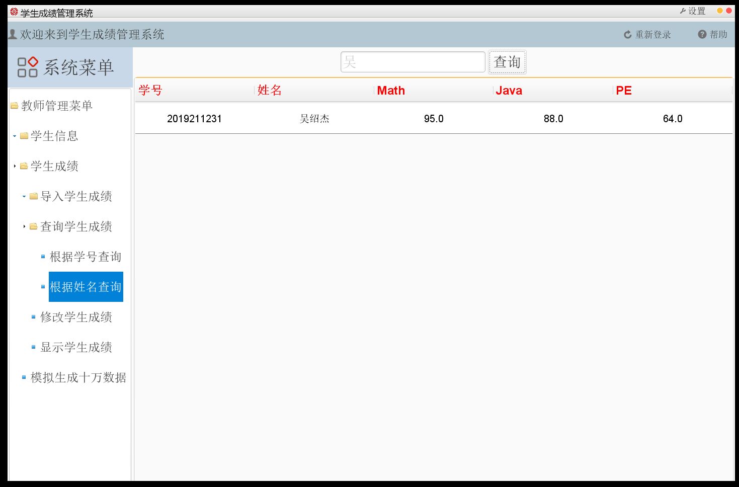 4. 根据学生姓名(支持模糊匹配)查找学生成绩,并在界面上显示姓名、学号和成绩,如果有多个相同姓名学生存在,一起显示出来,姓名不存在的给出提示信息