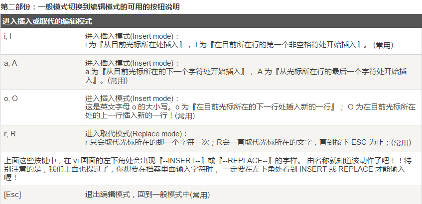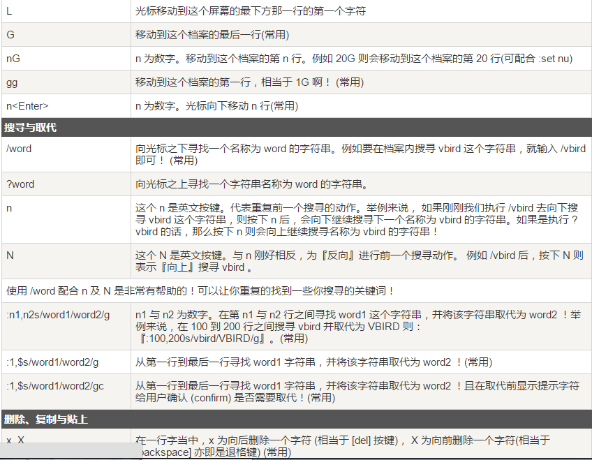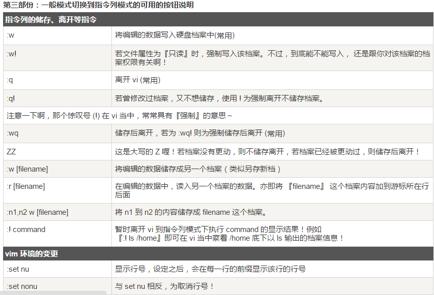 - 命令行模式:输入Esc后在输入:到达命令行模式,可以完成读取、存盘、替换、离开vim 、显示行号等动作