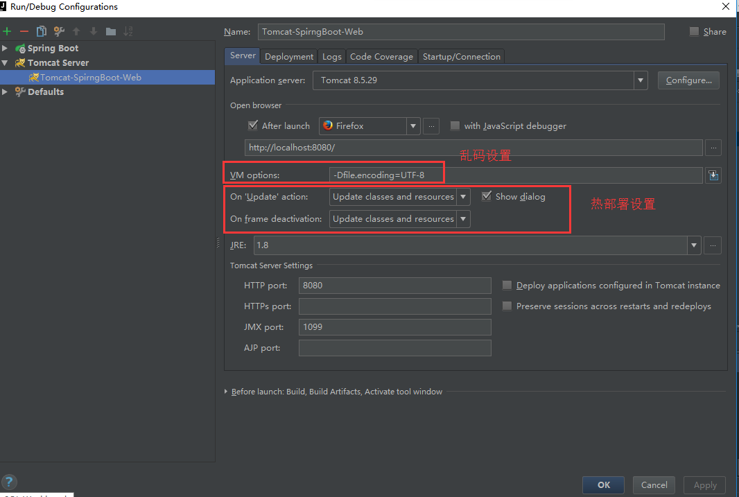 首先打开tomcat配置界面,在server中 将 "On Update action"、"On frame deactivation" 都选择 update classes and resources