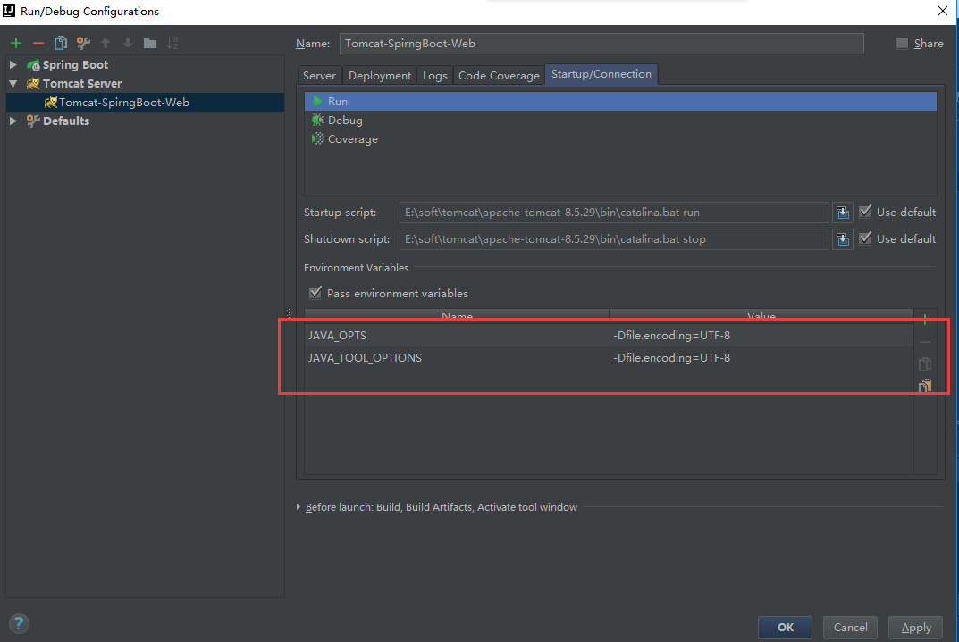 在startup/connection页设置JAVA_TOOL_OPTIONS为-Dfile.encoding=UTF-8