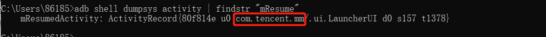 appActivity,即被测app的launcherActivity。通过命令adb shell dumpsys activity | findstr “mResume”查看(先在手机上打开app,再输入命令)。以微信为例。