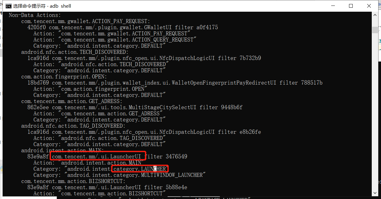 dumpsys package 包名 回车之后找到包含“category.LAUNCHER” 字样的Activity即可