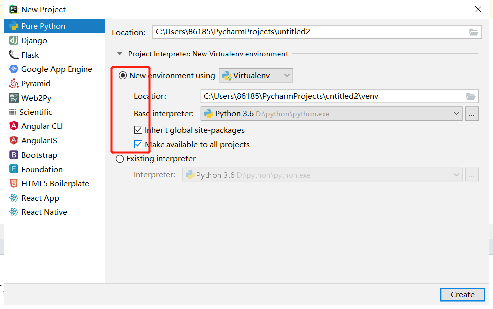 Name是虚拟环境的名字,Location是保存的位置,Base interpreter是源Python解释器的位置,Inherit global site-packages:是否要继承源解释器环境中安装的第三方包(pip install xxx 的包)。