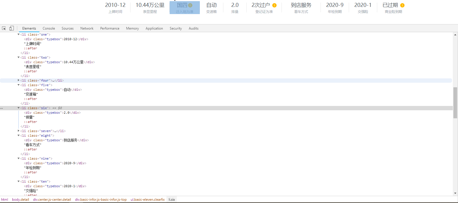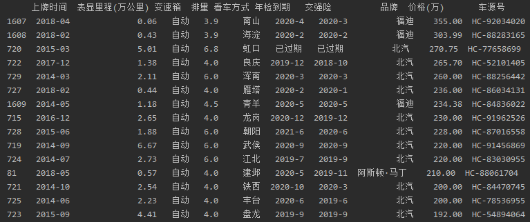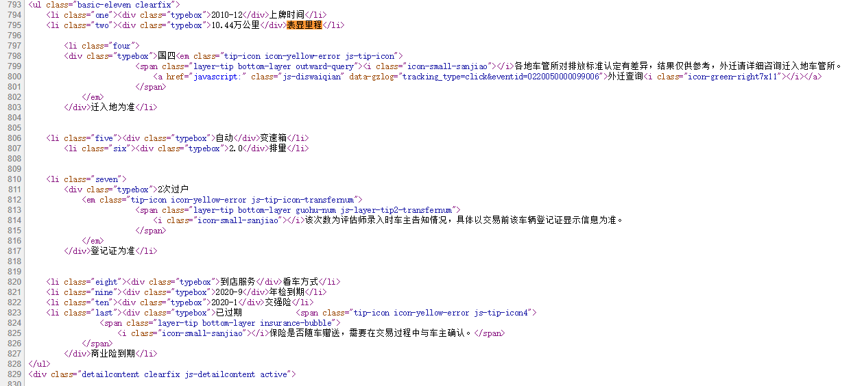 (1)获取'上牌时间', '表显里程', '变速箱', '排量', '看车方式', '年检到期', '交强险', '品牌','价格','车源号'内容