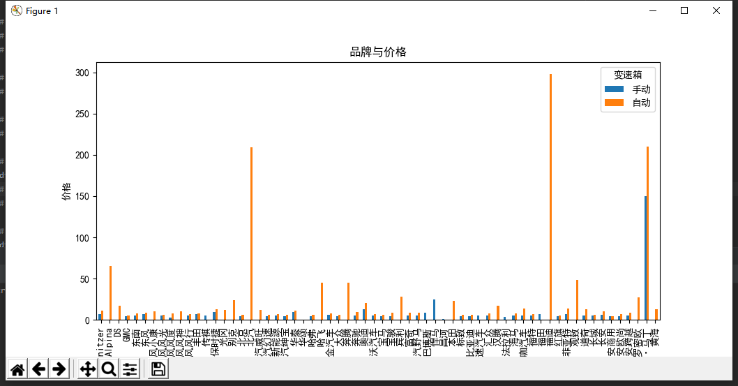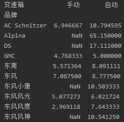 # 关于品牌、变速箱与价格的透视表,以便在购车时的更好选择 df_pivot = df.pivot_table(index='品牌',columns='变速箱',values='价格(万)') df_pivot.shape print(df_pivot.head(10))