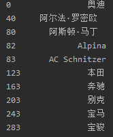 # 查看所有汽车的品牌有哪些 a = [] for i in df['品牌']: a.append(i) # 将得到的汽车品牌存放到Series里 a_series = pd.Series(a).drop_duplicates() print(a_series.head(10))