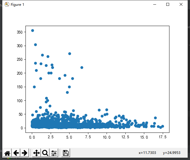 plt.scatter(df['表显里程(万公里)'],df['价格(万)']) plt.show()