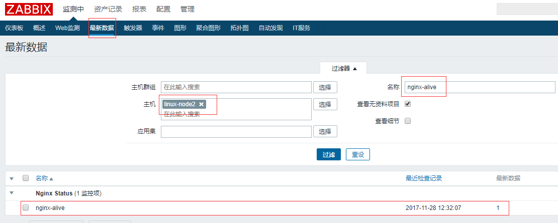 [root@linux-node2 zabbix]# pwd /etc/zabbix [root@linux-node2 zabbix]# ll -rwxr-xr-x 1 zabbix zabbix 1288 Oct 29 17:10 zabbix_nginx_plugin.sh 加上对应的权限