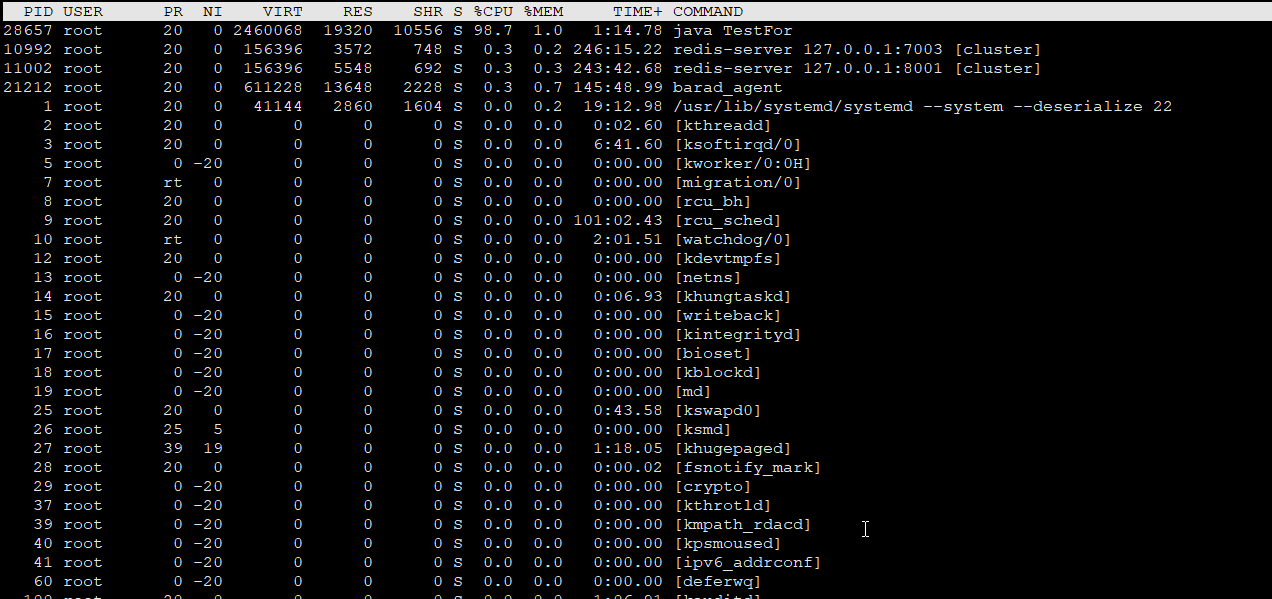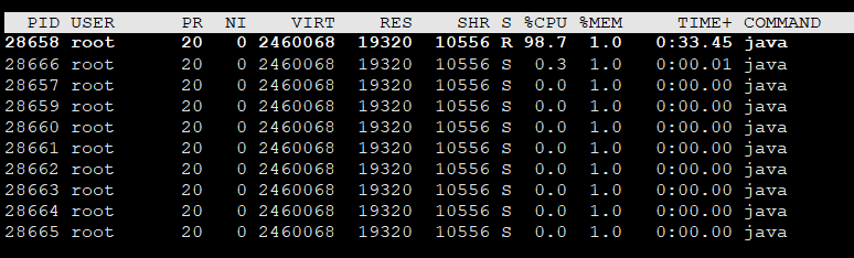 ②使用 top -Hp $PID ,例如这里的PID为28657 ,进行线程跟踪