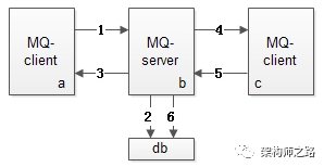 MQ消息投递上半场,MQ-client-sender到MQ-server流程见上图1-3:(1)MQ-client将消息发送给MQ-server;画外音:此时业务方调用API:SendMsg。(2)MQ-server将消息落地,落地后即为发送成功;(3)MQ-server将应答发送给MQ-client;画外音:此时回调业务API:SendCallback。