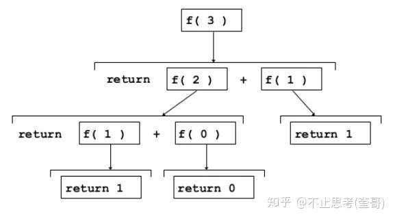 可以看出,这个逻辑是满足上面2个基本条件,假如求解 f(3),那 f(3)=f(2)+f(1),因此我们得继续去求解f(2),而 f(2)=f(1)+f(0),因此整个求解过程其实就在不断的分解问题的过程,将大问题f(3),分解为f(2)和f(1)的问题,以此类推。既然可以分解成子问题,并且子问题的解决方法与大问题一致,因此这个问题是满足“可调用自己”的递归要求。