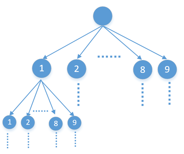 这题说的很明白,就是从1-9中选出k个数字,他们的和等于n,并且这k个数字不能有重复的。所以第一次选择的时候可以从这9个数字中任选一个,沿着这个分支走下去,第二次选择的时候还可以从这9个数字中任选一个,但因为不能有重复的,所以要排除第一次选择的,第二次选择的时候只能从剩下的8个数字中选一个……。这个选择的过程就比较明朗了,我们可以把它看做一棵9叉树,除叶子结点外每个节点都有9个子节点,也就是下面这样
