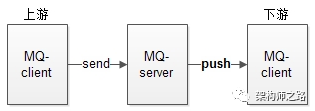 在某些业务场景之下(具体哪些业务场景,见《到底什么时候该使用MQ?》),可以采用“MQ推送”,上游将消息发给MQ,MQ将消息推送给下游。