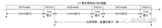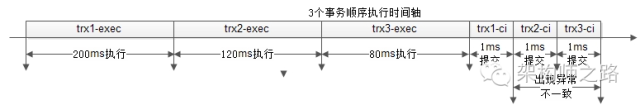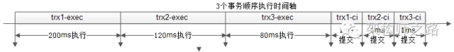 一个事务,分成执行与提交两个阶段,执行的时间其实是很长的,而commit的执行其实是很快的,于是整个执行过程的时间轴如下: