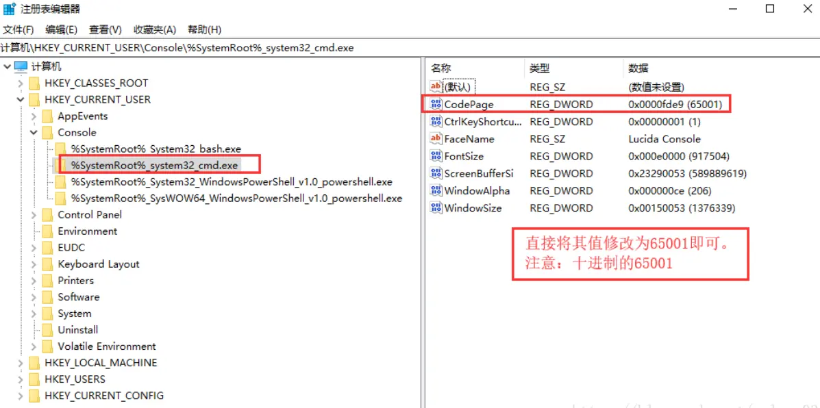 右侧如果没有CodePage,则右键新建一个DWORD值,直接将其修改为65001即可(十进制的65001)