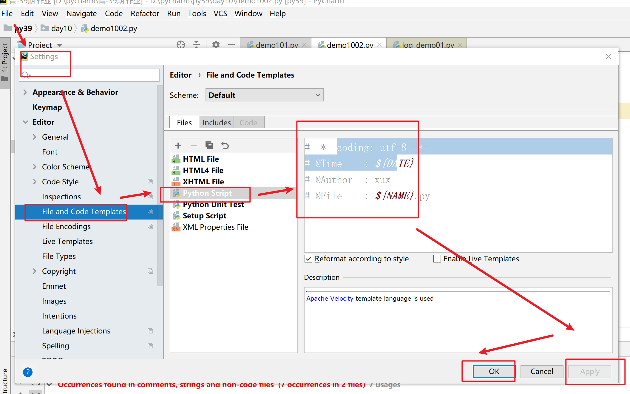 File ----->> Setting ----->> Editor ----->> File and Code Templates ----->> Python Script