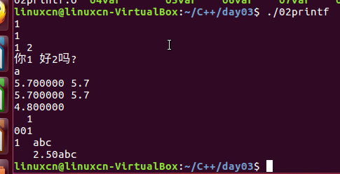 /* printf练习 */ #include <stdio.h> int main() { printf("1\n"); printf("%d\n", 1); printf("%d %d\n", 1, 2); printf("你%d 好%d吗?\n", 1, 2); printf("%c\n", 'a'); printf("%f %g\n", 5.7f, 5.7f); printf("%lf %lg\n", 5.7, 5.7); printf("%d\n", 4.8); //数据和占位符不匹配 printf("%3d\n", 1); printf("%03d\n", 1); printf("%-3dabc\n", 1); printf("%7.2fabc\n", 2.5f); return 0;