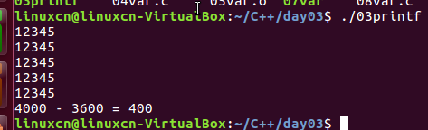 /* printf练习 */ #include <stdio.h> int main() { printf("12345\n"); printf("%d\n", 12345); printf("1%d5\n", 234); printf("1%c3%c5\n", '2', '4'); printf("%d%c%d\n", 12, '3', 45); printf("%d - %d = %d\n", 4000, 3600, 4000 - 3600); return 0; }