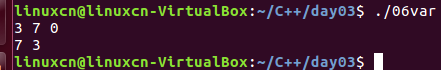 /* 变量练习 */ #include <stdio.h> int main() { int shu_zi = 3, shu_zi1 = 7, shu_zi2 = 0; printf("%d %d %d\n", shu_zi, shu_zi1, shu_zi2); shu_zi2 = shu_zi; shu_zi = shu_zi1; shu_zi1 = shu_zi2; printf("%d %d\n", shu_zi, shu_zi1); return 0; }