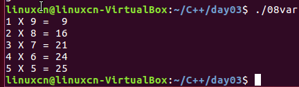 /* 变量练习 */ #include <stdio.h> int main() { int shu_zi = 0; shu_zi = 1; printf("%d X %d = %2d\n", shu_zi, 10 - shu_zi, shu_zi * (10 - shu_zi)); shu_zi = 2; printf("%d X %d = %2d\n", shu_zi, 10 - shu_zi, shu_zi * (10 - shu_zi)); shu_zi = 3; printf("%d X %d = %2d\n", shu_zi, 10 - shu_zi, shu_zi * (10 - shu_zi)); shu_zi = 4; printf("%d X %d = %2d\n", shu_zi, 10 - shu_zi, shu_zi * (10 - shu_zi)); shu_zi = 5; printf("%d X %d = %2d\n", shu_zi, 10 - shu_zi, shu_zi * (10 - shu_zi)); return 0; }