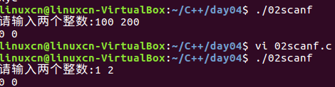 /* scanf练习 */ #include <stdio.h> int main() { int shu_zi = 0, shu_zi1 = 0; printf("请输入两个整数:"); scanf("abc%d def%d", &shu_zi, &shu_zi1); //scanf("%d", shu_zi); 段错误 printf("%d %d\n", shu_zi, shu_zi1); return 0; }
