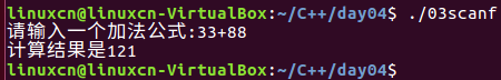 /* scanf练习 */ #include <stdio.h> int main() { int shu_zi = 0, shu_zi1 = 0; printf("请输入一个加法公式:"); scanf("%d + %d", &shu_zi, &shu_zi1); printf("计算结果是%d\n", shu_zi + shu_zi1); return 0; }