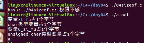 /* sizeof练习 */ #include <stdio.h> int main() { char zi_fu = 0; unsigned char u_zi_fu = 0; printf("变量zi_fu占%d个字节\n", sizeof(zi_fu)); printf("char类型变量占%d个字节\n", sizeof(char)); printf("变量u_zi_fu占%d个字节\n", sizeof(u_zi_fu)); printf("unsigned char类型变量占%d个字节\n", sizeof(unsigned char)); zi_fu = 'a'; sizeof(zi_fu = 'b'); printf("%c\n", zi_fu); return 0; }